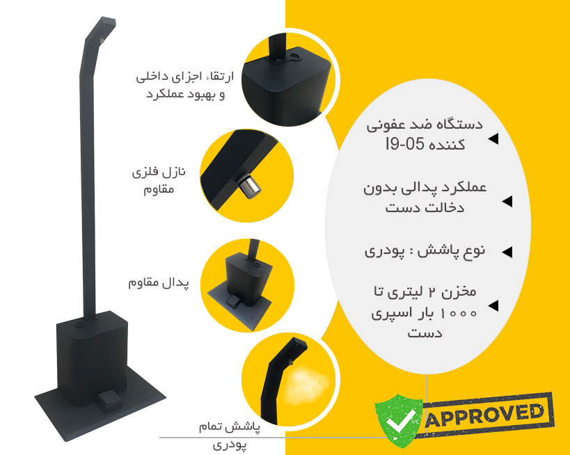 دستگاه ضد عفونی کننده پدالی مدل I9-05 محصولی است که در آن تمامی نواقص محصولات پیشین در این زمینه مرتفع گردیده است.