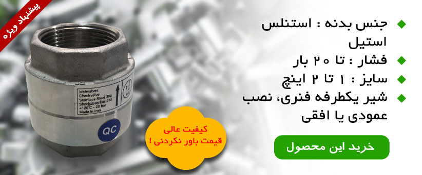 لازم به ذکر است تمامی شیر های یکطرفه نیازمند حداقل فشار ورودی جهت عملکرد می باشند که این مقدار حداقل در شیر های یکطرفه فنری اندکی بیشتر است. مزیت شیر یکطرفه فنری نسبت به نوع معمولی آن این است که غالبا” این شیر ها علاوه بر حالت عمودی قابلیت نصب به شکل افقی را نیز دارا می باشند.