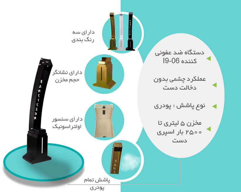 از آنجایی که ضد عفونی کردن دست ها در دوران کرونا به مراتب توسط مسئولین بهداشت کشور و سازمان جهانی بهداشت توصیه می شود. ضد عفونی کننده اتوماتیک دست مدل I9-06 محصولی است. که دقیقاً متناسب با نیاز سازمان ها و ادارات طراحی و تولید شده است. این محصول به دلیل ساختار ساده و در عین حال کاربردی هم از قیمت مناسب و هم از عملکرد خوبی برخوردار است.